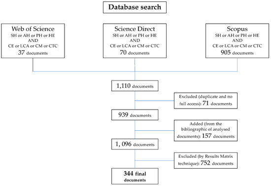 At level two of the research, we sought to fulfil specific objective 2. For each of the three databases, the search for SH (and other terms defined at level one) was combined with CE (and other terms defined at level one). Three selection lists were created from this selection, with 905 documents from Scopus, 37 from Web of Science, and 70 from ScienceDirect.