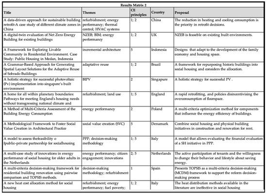 With this selection, the following data were extracted from each document and noted in the following columns, corresponding to each document: study theme; Circular Economy principles related to the study topic; proposals suggested by the studies; country dedicated to study; year of the document; and the bibliographic reference. Specific objectives 3, 4, and 5 were thus met. Figure 3 illustrates part of Results Matrix 2.