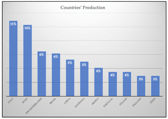 In this SLR, 57 countries produced material with different themes. Figure 6 shows the eleven (England and India tied in the tenth position) countries that contributed most to the total number of publications.