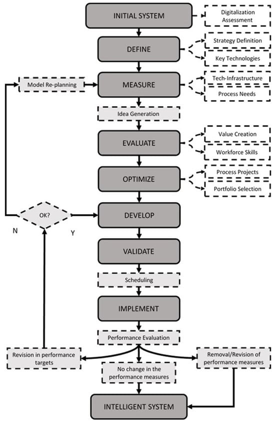 Subsequently, the company should define the project scope, identifying the systems and equipment slated for migration to intelligent alternatives. Simultaneously, it is required to specify which functions of the manufacturing system the transition should encompass, such as production control, quality control, and maintenance strategy. The transition must align with the company’s manufacturing priorities, be it cost reduction, dependability, flexibility, or quality improvement. Smart systems should offer solutions for efficiency, minimizing unexpected stoppages, facilitating rapid setups, and managing variability. Following the identification of strengths and weaknesses, manufacturing companies may establish collaboration agreements with technology providers [35] or even with other manufacturing entities or competitors to gain scale in certain expensive technologies [38]. The anticipated outcomes at this stage include strategic definitions and the identification of key necessary technologies.