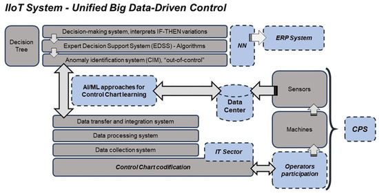 The coding of the Smart SPC model (or IntelliSPC—ISPC) involves the IT sector programming the control chart and integrating it with a CPS model from a data center. The process of making it “intelligent” for variation assessment, scenario prediction, and automatic process adjustments based on monitored item analyses is accomplished through artificial intelligence systems. Simply put, the control chart learns to adapt according to the monitored scenario. As a result, the analysis and decision-making process follows a streamlined decision tree model or more robust models composed of CIM, EDSS, and IF-THEN systems. Following this, the integration of the Smart SPC model into an ERP system enables managerial action analysis, facilitating data visualization through dashboards that observe the model’s variations, trends, and actions.