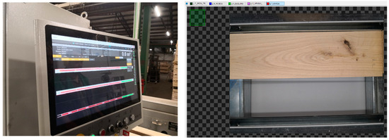 The introduction states that the first software solution comes with the Weinig CombiScan Evo R (LuxScan, Weinig group, Luxembourg, Foetz) industrial scanner (Figure 4). During production, the sawn surface is recorded while moving on both software in a wood-processing company (overlapping and combining multiple images into one combined photo). The first scanner has a maximum field of view of 600 mm and two mounted cameras (on the upper and lower sides of the sawn surfaces), while the second scanner has a maximum field of view of 300 mm and four cameras that encircle the entire sawn surface. Both cameras feature a 300 mm distance and 12 MP resolution. A second scanner was used for comparison.
