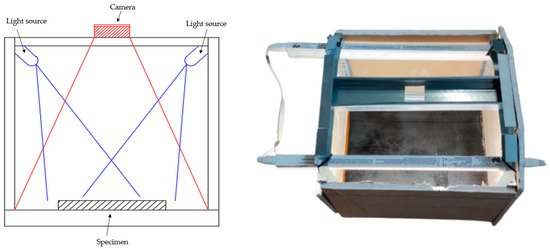 The first step of developing software solutions was laboratory imaging. After laboratory imaging (Figure 5), the photos were stored in a database, which made them available for software recognition. This database was used for training and comparison with software solution 1. The shooting conditions involved capturing images with a 12 MP camera (the same as on the Weinig industrial scanner) positioned with 315 mm between the surface and the camera lens. The illumination for this setup was provided by a 10 W light source, emitting 800 lumens at a color temperature of 4500 K. The camera was positioned at a 45° angle on each side for optimal image capture.