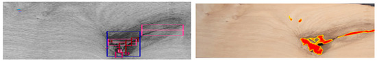 In specimen 8, both software were able to detect the crack accurately. However, software 1 failed to detect knots and wood rays but successfully detected ingrown bark. On the other hand, software 2 successfully detected knots and wood rays but failed to detect ingrown bark.
