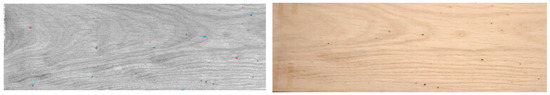 Lamellae manufactured from oak wood were prepared for the study, with dimensions of 700 × 100 × 2 mm (length × width × thickness). The study was conducted on a total of forty lamellae, all of which exhibited at least one of the six defects that were previously identified. The overall database has around 800 pictures, and it is wholly partitioned into clusters of defects intended for analysis and for the comparison of the performance of the two defect detection software. Thirty specimens were purposefully chosen to facilitate a comparative analysis of the software’s performance and its ability to produce accurate outcomes. This approach created a realistic manufacturing scenario, acknowledging that not all defects are uniformly prevalent throughout all saws or lamellae. The number of specimens on which a specific defect was found is presented in Table 1 (data in the table are based on visual assessment).