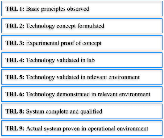Technology readiness levels (TRLs) is a methodological tool that emerged to assess the maturity of new technology. The approach was first developed and standardized by NASA []; the initial intention was to provide a disciplined way to differentiate between technology readiness levels. The original definition of TRL was a scale from level 1, corresponding to the formulation of a new concept, up to level 7, which ascertained that the system had been successfully demonstrated in a real environment []. Although initially used within NASA and aimed at securing a common language between research and operational personnel, the TRL approach has now extended well beyond NASA and the aerospace industry and has been widely adopted across research and industry. In the process, it has also expanded to nine levels []; indeed, this nine-level scale corresponds to the formulation currently in use worldwide. Numerous entities beyond NASA are using the TRL system, and Mankins [] provides evidence of a global adoption, even though some users may opt for some slight modifications or more extensive documentation on the meaning of every single readiness level. One example is the European Space Agency’s Handbook [], which defines each level by numerous standards that a technology must meet to be categorized at the particular level.