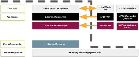 Figure 2, below, illustrates the exact positioning of the demand forecasting (dark gray rectangles) in such a multistakeholder environment. The term multistakeholder denotes that many third parties can integrate applications (third-party app library) and extract data (third-party data). The demand forecasting in question is just one case of such a third-party app.