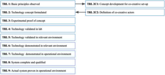 Co-creation has also captured the attention of the public sector, as the new public management theory relies on the concept of collaborative interaction, networks, and partnerships with the private sector and industry. In the literature review, Nuno Baptista et al. [] classified co-creation benefits in the public sector as innovation-related and improving decision making. According to the authors, the present context of austerity and reduced public resources has led policymakers and politicians to consider the benefits of co-creation, co-production, and innovation. Within this context, for innovations to produce the outcomes that matter, it is important that the key stakeholders are involved in the design [] and, hence, the TRL is adequate. According to Henry William Chesbrough, the open innovation model enables the advancement of valuable technologies both within and outside the current business models, promoting growth through investments []. Thus, once again, the question emerges of whether the current TRL model can highlight the true and effective readiness of these innovation developments and suggest the next natural step in ascending the maturity ladder, as there are studies that suggest that TRLs have shortcomings in manufacturing environments [] because of their imprecise interpretation and complex success factors [] and that they fall short in assessing integration readiness and compatibility with human capabilities and limitations [].
