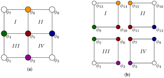 From the family of Gaussian quadrature schemes, one can achieve this using a Gauss–Lobatto quadrature of order equal to the polynomial order of the finite element. We note at this point that choosing this particular combination of quadrature method and number of nodes will lead to inexact integration and, thus, a numerical error is introduced. In this case, to produce a collocated scheme, one must pick the second-order Gauss–Lobatto variant using two quadrature nodes per coordinate direction. As this type of integration is known to be accurate up to degree , this scheme will only integrate linear polynomials exactly. However, the above-listed basis functions are bilinear and have a combined polynomial order of 2. Thus, integration will not be accurate in this case. However, the modern FEM in general does not prescribe any particular method of integrating the weak formulation, per se [31]. Thus, although the results of a properly implemented FEM in the sense of exact integration will be slightly more accurate, one can still show equivalence regarding a particular instance of the FEM.