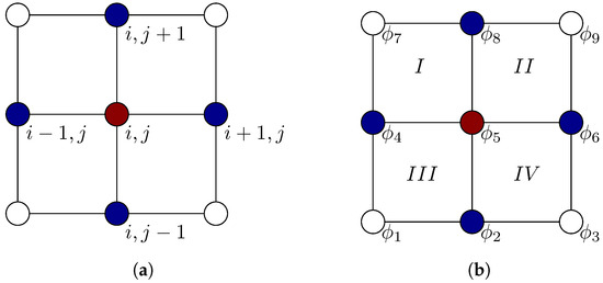 In the figures, i and j denote vertical and horizontal indices of grid nodes, are the FE basis functions, and Roman letters denote indices of cells. Forming, for example, the Laplacian for an FDM requires access to the vicinity of vertex (red node) in all Cartesian directions (blue-colored nodes). For both methods, gray-marked nodes do not pose a contribution to the value of the central node. For a special case of FEM with quadrilateral elements, the same nodes form contributions to the global basis function . However, we now do not evaluate the Laplacian operator directly but, instead, gather contributions from weak form integrals. In the case of , we have to gather contributions from cells I to .