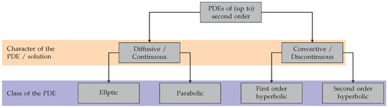 We apply this classification for each governing equation of the independent variables for a given multiphysics problem. In practice, one may oftentimes identify the class by the differential operators that frequently appear in a given PDE. For example, a PDE that only has a Laplacian as a spatial differential operator—such as the Laplace equation or the heat equation —exhibits dissipative behavior and is prototypical for elliptic and parabolic PDEs. Oftentimes, one can easily identify a differential operator as parabolic if it has an elliptic operator in its spatial derivatives and an additional temporal derivative, as is exactly the case for the heat equation.