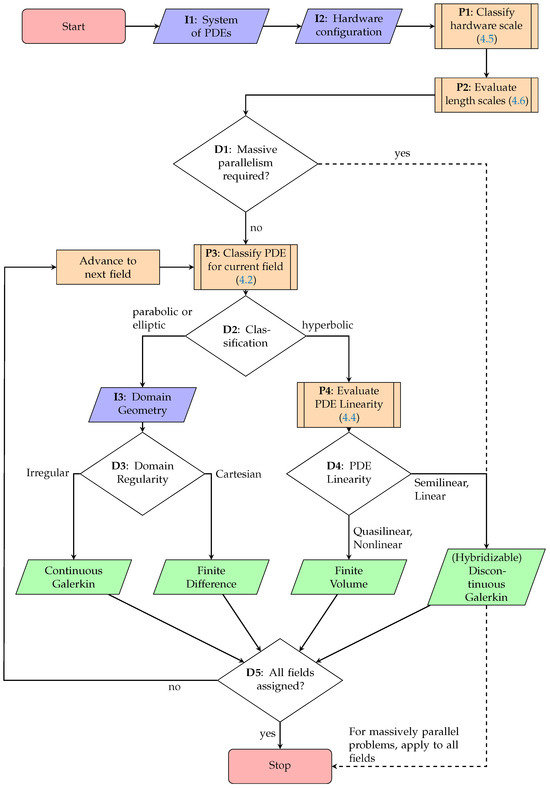 With the set relations between methods discussed in Section 3, we can now use the simplifications and, thus, computational advantages that each scheme presents. That is, we follow the guideline to impose as many restrictions as possible whilst sustaining enough degrees of freedom to accurately capture the behavior of a given PDE. In this way, we aim to provide the application expert with a recommendation on which schemes to use for a particular computational problem. Our key concerns are, above all, to make this recommendation unambiguous. Also, we focus on providing recommendations that will produce a stable solution and do not require tuning of artificial parameters. If at least either of both requirements were not given, the usefulness of this method would be lost as one would have to undergo substantial experimentation to attain a valid solution. Thus, by proposing such a method, we aim to give a sensible trade-off between practicality and reproducibility, on one hand, and utmost performance at the cost of possibly many model-building iterations and tuning, on the other hand.