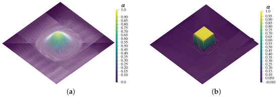 - We omit function spaces for approximation other than the and Sobolev spaces. There exist a vast variety of so-called mixed finite element schemes that use finite elements based on different or composite function spaces with unique properties [42]. For example, one may construct function spaces that can exactly fulfill divergence-free properties () or conditions based on the rotation of a field (). The specific choice of finite element, then, would require a considerable amount of expertise and would warrant a complex decision process of its own. Furthermore, the number of elements available for such spaces is vastly ambiguous, as outlined in Section 1. We thus focus on scalar-, vector-, and tensor-valued Lagrange elements solely. They have been shown to encompass a similar solution space as well and perform comparably for fluid and electromagnetic problems [43,44]. In summary, we similarly sacrifice some freedom in choosing possibly very-well-suited function spaces for the benefit of attaining a decision metric that allows for an unambiguous recommendation.