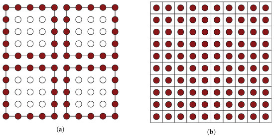 Comparison of the nodal nature of the FDM (a) versus the cell-wise assembly used in the CG FEM (b) for an identical, Cartesian triangulation with 9 nodes. Both methods are formulated as first-order approximations. Red-colored nodes signify the points where the PDE is evaluated. Contributions to this node are taken from blue nodes, whereas no contribution—white nodes.