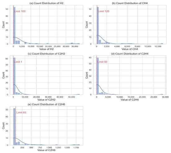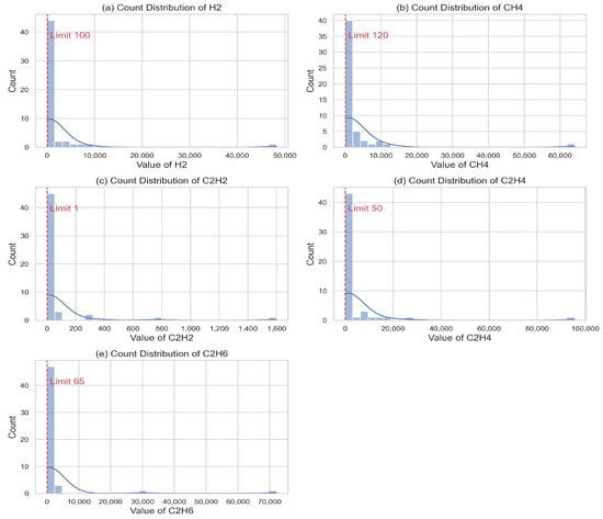 Distribution of the 52 samples classified as thermal failure: (a) samples of H2; (b) samples of CH4; (c) samples of C2H2; (d) samples of C2H4; and (e) samples of C2H6.