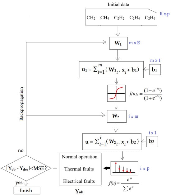 Pattern recognition artificial neural networks (PRNs) are feedforward networks designed to classify inputs into predefined target classes. In pattern recognition networks, the target data typically comprises vectors containing all zeros except for a 1 in the element corresponding to the class it represents [26]. In pattern recognition problems, it is desired that a neural network classifies inputs into a set of target categories. For example, classify the operating condition of a power transformer as normal, thermal faults, or electrical faults based on combustible gases concentrated inside them. There are two classification methods in pattern recognition: supervised and unsupervised. To apply supervised pattern recognition, a large set of labeled data is required. If these are not available, an unsupervised approach can be applied. This work presents a supervised approach.