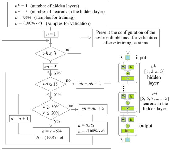 During training using the backpropagation algorithm (SCG), the network follows a two-step process. Initially, a pattern is introduced to the network’s input layer. The resulting activity propagates through the network, layer by layer, until the output layer generates a response. In the second step, this output is compared to the desired output for that specific pattern. If they do not match, the error is computed. This error is then propagated backward from the output layer to the input layer, and the connection weights of the internal layer units are adjusted accordingly. This process underscores the potential of the PRN application, which can function both as a classification and prediction tool. Based on this, a procedure was developed to initialize the training program multiple times, using different configurations, both for the number of hidden layers and the number of neurons (varying in increments of 1), as well as for the proportions of training and validation samples (varying in increments of 5%), as presented in the flowchart in Figure 6. After repeating the process n times, the best result obtained was stored, corresponding to the most effective configuration (optimal number of hidden layers and neurons) that resulted in the highest accuracy percentage in the validation phase. In the study in question, the most successful configuration consisted of one hidden layer with 10 neurons, with 20% of the samples reserved for validation.