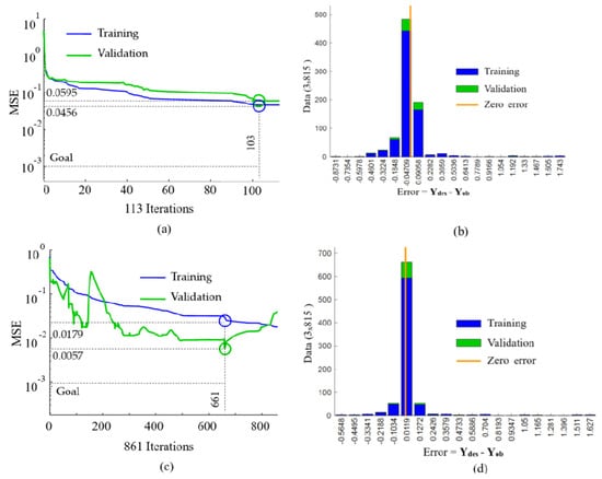 PRN performance: (a) training and validation performance (MSE) for PRN with 5 neurons in hidden layer, (b) error histogram (Ydes − Yob) for PRN with 5 neurons in hidden layer and 20 intervals for the 815 output samples, (c) training and validation performance (MSE) for PRN with 10 neurons in hidden layer, (d) error histogram (Ydes − Yob) for PRN with 10 neurons in hidden layer and 20 intervals for the 815 output samples.