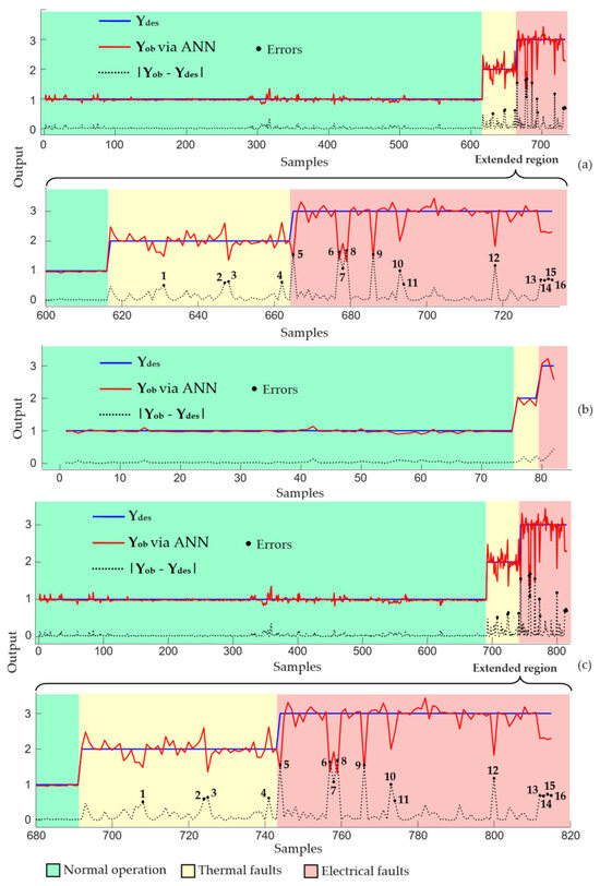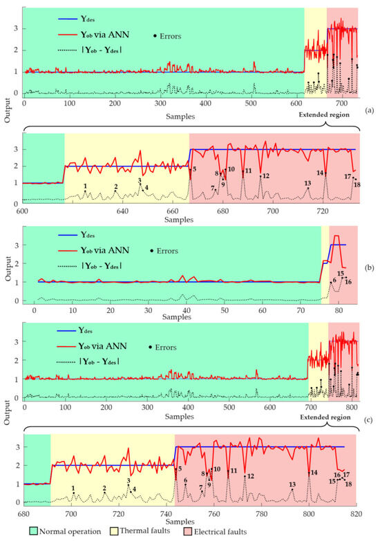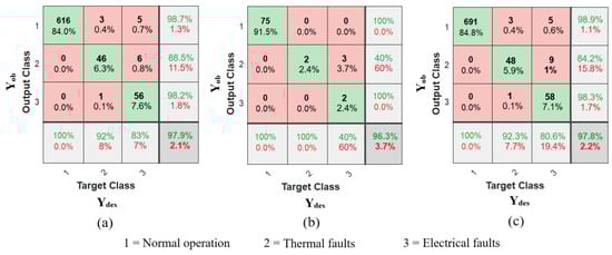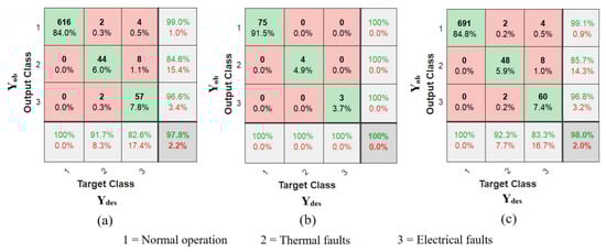 In Figure 9, the first three diagonal cells show the number and percentage of correct classifications after the training (Figure 9a) and validation (Figure 9b) of the network, respectively. For example, in Figure 9a, 616 samples are correctly classified as class 1 (normal operation). This corresponds to 84% of all 733 samples. Similarly, 46 cases are correctly classified as class 2 (thermal faults). This corresponds to 6.3% of all samples. Finally, 56 samples were classified as class 3 (electrical faults), corresponding to 7.6% of all samples.