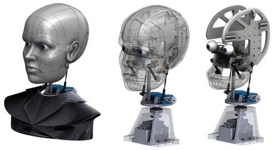 Other robotic head platforms worth mentioning include Alan and Alena [38], which are highly customizable and designed to utilize technologies related to sound and image-processing tasks. Another notable platform is Furhat [42,43], equipped with a 3D display that allows it to show facial movements and expressions. It can both receive and emit sound, enabling it to engage in conversations. Kismet is a robot head with a cartoonish face that can engage in social interactions [44]. Also, Fritz was shown in [45] as a humanoid robot with degrees of freedom in the face and the arms that allowed it to interact with people using modalities like speech, facial expressions, and gestures. Additionally, “Han” is a humanoid robot capable of recognizing and interacting with people. It uses cameras and voice recognition technology. It can perform complex facial expressions and has about 40 motors to control its artificial facial muscles. The face is covered in a soft, flesh-like rubber allowing it to move in a human-like way [46,47,48].