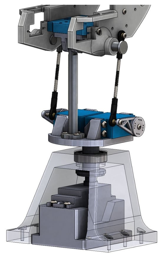 The pitching motion is driven by two synchronized servo motors actuating a set of parallel four-bar linkages with identical input, but moving in the opposite direction.
