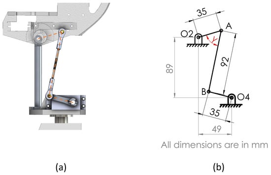 (a) Side view of the neck pitching mechanism with the kinematic chain highlighted in orange; (b) kinematic diagram of the pitching mechanism showing the transmission angle .
