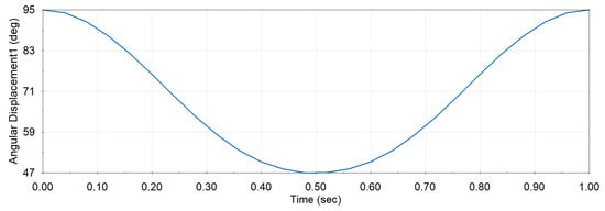 Figure 7 shows a simplified kinematic diagram of the linkages; O4B is the crank, which is actuated by the servo motor, AB is the coupler link, and O2A is the output link, which is a part of the internal frame of the head. The rotation of the output link results in the pitching motion of the head. The folded-in configuration of the crank-coupler is selected as it delivers a good overall transmission angle and keeps the neck compact. A kinematic motion study is performed using the SolidWorks motion analysis package by simulating the crank rotation for one complete cycle of operation. The transmission angle is the angle between the coupler and the rocker and it is an important parameter indicating the efficiency of force transfer between the links. The motion analysis results show that the transmission angle varies from to , as shown in Figure 8, ensuring an efficient and smooth motion.