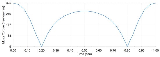 The head’s center of mass is offset from the neck pivot by a radial distance of 70 mm and can create unbalanced forces of varying magnitudes depending on the angle of the head. This off-balance mass also results in inertial forces, especially when there is a sudden change in direction as in a nodding motion. A dynamic force analysis is, hence, found suitable for capturing the internal forces in the system. The nodding motion is simulated in SolidWorks by applying two virtual motors as the servomotor with a pitching angle of to match the range of motion of the actual robot. These motors are then set to oscillate at 1 Hz around the horizontal plane to simulate the nodding motion. The results show a peak motor torque of 325 N-mm (see Figure 9). This occurs when the head changes direction from a downward to an upward motion. At this position, the center of gravity of the head is furthest from the neck pivot, which creates a high unbalanced force. The structural analysis presented in the following section is performed in this critical position with the highest internal forces. The two notches observed in the chart around 0.2 s and 0.8 s correspond to the position where the head is perfectly upright and the center of mass is vertically above the neck pivot. At this position, the head is perfectly balanced and, hence, very little motor torque is required to support the head.