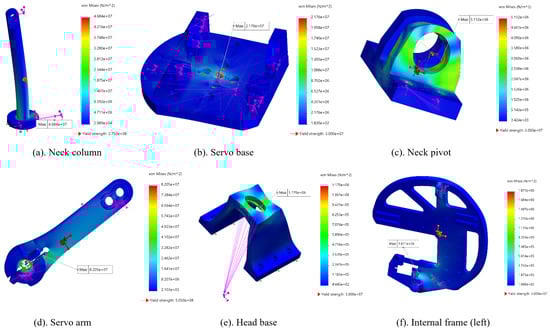 Stress analysis performed on the important load-bearing members of the neck is depicted in Figure 10. The dynamic forces applied to each of the members are obtained directly from the SolidWorks motion study. These are applied as remote loads in the simulation and are shown in the figure using pink lines; the region of maximum stress is highlighted and the corresponding values are displayed.