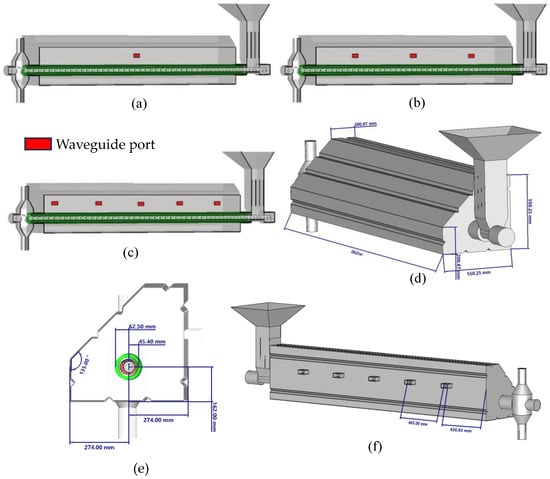 Figure 1 shows the technical design of the MW prototype. The treatment chamber consists of a polypropylene tube (green region) with an inner diameter, outer diameter and length of the tube of 90.8 mm, 125 mm, and 3000 mm, respectively. Inside the tube a rotating metallic helix allows the almonds to be mixed and moved from the supply section to the discharge section. On the feeding side is placed a honeycomb filter integrated with the feed hopper. The dust extraction chamber is shown on the opposite side. Figure 1 shows three different setups with 1, 3 and 5 MW sources equidistant from each other along the treatment chamber: