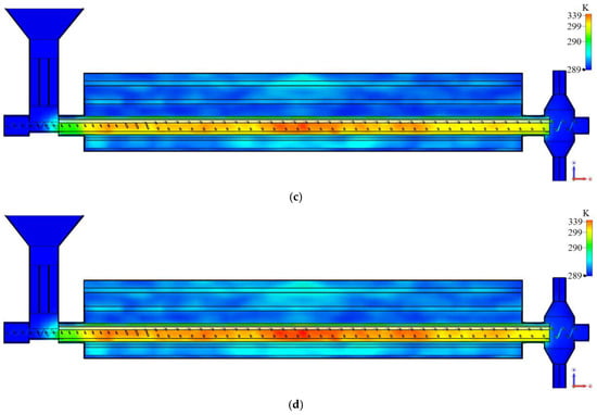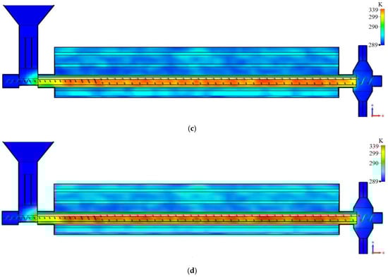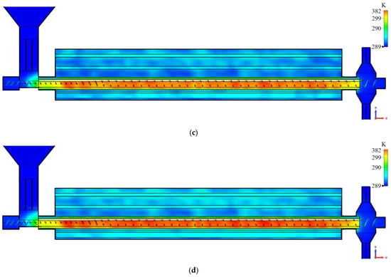 Figure 2a, Figure 3a and Figure 4a show the 2D electric field intensity profiles corresponding to arrangement 1, arrangement 2 and arrangement 3, respectively. In all three arrangements a very good electric field confinement inside the treatment chamber was obtained. Moreover, it can be inferred that the honeycomb filters effectively shield the electromagnetic field from escaping into the external environment. The corresponding temperature profiles at residence times of 80 s, 140 s and 200 s are shown in Figure 2b–d, Figure 3b–d and Figure 4b–d, too. Arrangements 1 and 2 exhibit a non-uniform temperature distribution having hot spots located in the regions of space close to the sections where the microwave power is started within the treatment chamber. Furthermore, the thermal non-uniformity increases as the residence time increases. On the other hand, arrangement 3 ensures a quite uniform temperature distribution inside the polypropylene tube filled with almonds even for long treatment times.