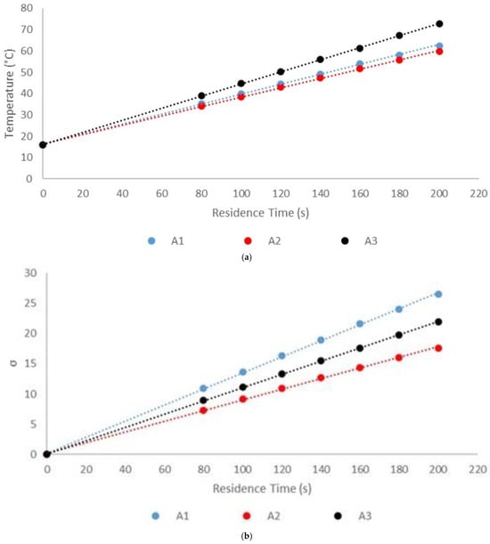 Figure 5a highlights that in arrangement A3, after 150 s of treatment the final temperature exceeded 60 °C (goal of the design). The arrangements A1 and A2 had a similar temperature trend, but the temperature of 60 °C could only be reached after 200 s. Even if A3 had a standard deviation trend central to the other two conditions (see Figure 5b), it had the lowest trend of the COV, thus proving the configuration with better thermal uniformity (see Figure 5c). As a result, the A3 appears to be the most effective.