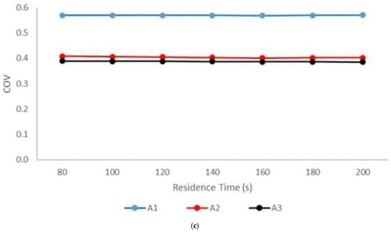 Trend of simulated temperature vs. residence time. (a) Mean temperature, (b) standard deviation and (c) COV.