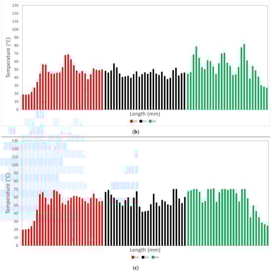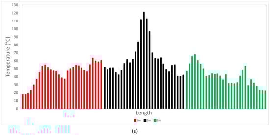By an inspection of Figure 6a, it is clear a hot spot in the central zone of the treatment chamber, thus confirming that a single MW source is not able to ensure uniform temperature heating over the entire length. Moreover, by inspecting Figure 6b,c, an improvement in the heating uniformity, starting from A2 to A3, can be observed.