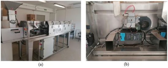 Figure 7a shows the pilot plant prototype and Figure 7b a detail illustrating the magnetron generator (MW source) with the corresponding power supply, control, and cooling systems.