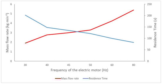As the frequency of the electric motor and the rotation speed of the helix inside the treatment tube increased, the residence time decreased, and the mass flow rate increased proportionally in the first half of the trend while in the second section it tended to saturate. This means that, although the helix inside the tube mixes the almonds well, the corresponding mass transport from the supply section to the discharge one does not occur with the same efficiency. In fact, once a certain rpm value of the helix has been exceeded, the almonds do not advance proportionally to the rotation speed of the helix.