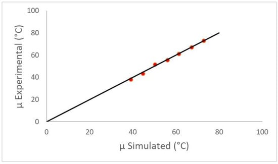 The relationships between the mean temperature value, both simulated and experimental, are shown in Figure 10.