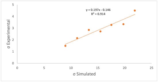The standard deviation for experimental data was much lower than the simulated one, consequentially leading to a high RMSE value (13.02), as shown in Table 4. This means that there is no good match between the simulated and measured standard deviations. However, between them a strong linear regression was detected (R2 = 0.91), as shown in Figure 11. This means that even the standard deviation can be predicted.