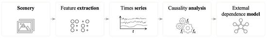 The process described in Figure 1 involved the use of various materials (refer to Table 1). It began with a scenario composed of a sequence of images that were analyzed by a background model. This model helps to detect objects, enabling the application of geometric descriptors to extract characteristic features of moving objects. Feature extraction was carried out during offline periods of a week, specifically in the selected streets. The information obtained from this process was then used to generate a time series. Trajectories were grouped based on the number of detected objects, and causality analysis techniques were applied to characterize the behavior of the road scenario. The correlation matrix obtained in the causality analysis was then used to create an external dependence model using graphs.