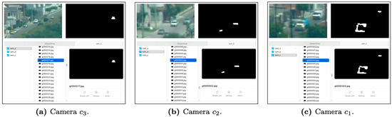 Dataset generation and ground truth of the study scenery. Although, a change in image quality can be noted, all the data were acquired correctly: (a) dataset of 504,762 images obtained from camera ; (b) dataset of 504,762 images obtained from camera ; (c) dataset of 504,762 images obtained from camera . The above was recorded at an instant of time for an image sequence .