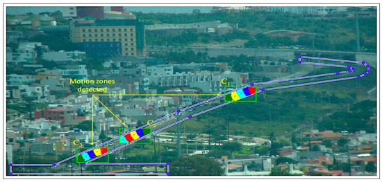 The scenery is a planned monitoring scheme that employed three professional dome cameras from PTZ VIVOTEK, model SD9364-EHL. These cameras have real-time compression in formats H.265, H.264, and MJPEG (triple codec), a 30× zoom lens, a wide temperature range (−50~55 °C) for extreme weather conditions, and a vandal-resistant enclosure with NEMA 4X. In addition, an Alienware Aurora Dell-branded computer with a Linux Ubuntu 18.04.6 LTS operating system and Core i7-9700K with a 3.6 GHz to 4.9 GHz processor. The above is to capture and analyze data for this work. This is a technological resource used to identify the behavior of moving objects (vehicles). Thus, identifying situations of interest is employed to model and find an optimal representation of the object’s movement. Figure 2 shows the camera positioning along the Paseo de la Constitución Avenue, Querétaro city in México.
