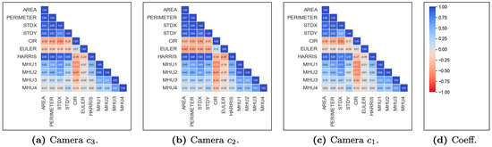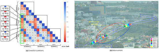 It is shown that the high probability of +0.85 indicates the dependence between two states that are not adjacent but are at a distance and a behavior is being observed and that behavior helps to infer that possible states are altered once the state of reference begins to change the dynamics of the vehicular flow. For example, the positive correlation of +0.85 in blue between the zero regions of camera and camera (see Figure 12) means that when the zero region of camera presents traffic or there are high increases in their geometric measurements of the objects (area and perimeter, see Figure 12d), proportionally there is also traffic or high increases in the zero region of camera . These patterns are the result of associating through causal relationships to say what the origin of traffic is at a certain time of day, the effects that an accident generates on a road artery and which ones will be affected, and changes or closures of roads due to events, parades, or demonstrations.