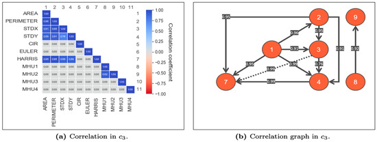 As the traffic dynamics are changing, the square correlation () “ matrix” is used to find the correlations of the flow intensity, which in this case is through geometric measurements/characteristics (see Figure 7 and Figure 8). Based on Section 2.4, a correlation close to zero means no relationship, but high or maximum local correlations in their absolute values represent indications of a positive or negative relationship.