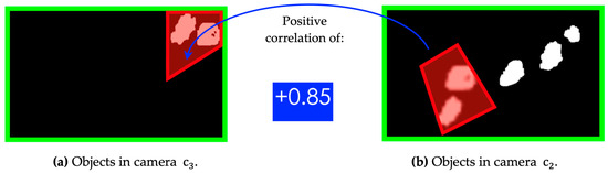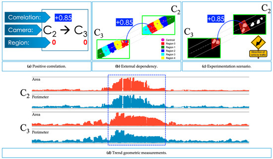 The particular case of high positive correlation: (a) attributes that describe the correlation between two cameras; (b) illustration of regions between different cameras and their correlation; (c) experimental scenario showing the direction of flow and correlation; (d) trend graph of the geometric variables area and perimeter that reference to correlation behavior.