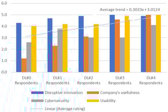 The aggregated ratings from respondents underscored the perceived innovation of the Cockpit4.0+ system, with an impressive average score of 3.9 out of 5. This highlights the prototype’s potential functional efficacy within the sector. Notably, the perceived usefulness of the system exhibited a positive correlation with the companies’ digital maturity. Among the most digitally advanced respondents (DL#4), the system achieved high scores, averaging 4.8 out of 5.