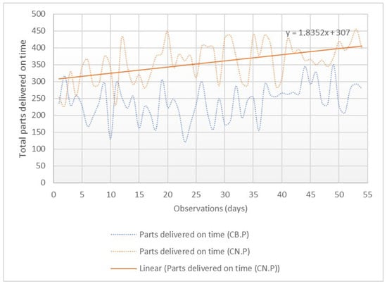 Based on these findings, under CB.Ps, the on-time delivery performance was recorded as 67.1%, with 240 out of 339 parts being delivered as scheduled. In contrast, CN.Ps resulted in a significant increase in KPI
