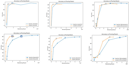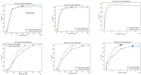However, a “breakpoint” arises where accuracy drops significantly faster relative to parameter reduction. Remarkably, in our results, many student models achieve comparable or better accuracy than distilled models at this breakpoint. This emphasizes the effectiveness of combining knowledge distillation and pruning for improved efficiency without accuracy loss. At the breakpoint, students leverage the teacher’s insights, maintaining performance despite fewer parameters [1].