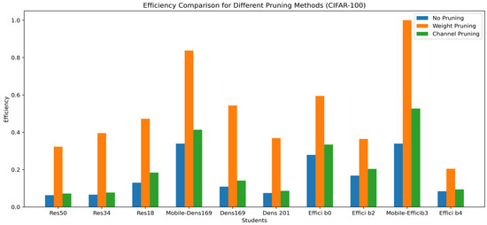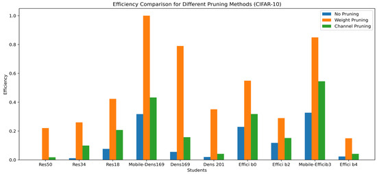 In Figure 3 and Figure 4, we depict the outcomes of our efficiency comparison analysis. These results are based on the application of the efficiency formula, where we have chosen the balanced weights of w1 = w2 = 0.5. The comparison encompasses diverse student models and employs distinct pruning methodologies. The CIFAR-10 and CIFAR-100 datasets serve as the testing grounds for our investigation. These bar charts offer a visual representation of the impact of pruning techniques on the efficiency of the student models, shedding light on the trade-offs between model complexity and performance. They illustrate the efficiency comparison of student models across two pruning methods on the CIFAR-10 and CIFAR-100 datasets. Each bar in the chart represents the normalized efficiency score of a student model under different pruning strategies. Notably, the distinct patterns that emerge from the chart provide valuable insights into the effectiveness of each pruning method. Our investigation sheds light on how each method affects the efficiency of the models and offers valuable insights into their relative advantages and limitations. From the generated charts for both the CIFAR-10 and CIFAR-100 datasets, it is evident that the impact of pruning methods on efficiency varies across different student models. Weight pruning consistently results in improved efficiency compared to the other methods, with reductions in the number of parameters leading to better performance. This aligns with the expectation that weight pruning targets redundant parameters, leading to more efficient representations while maintaining accuracy. In the realm of channel pruning, it is evident that the efficiency of the pruned models surpasses that of the distilled student models, albeit by a relatively modest degree. However, a more pronounced distinction emerges when comparing channel pruning to weight pruning. In this context, the efficiency achieved through weight pruning consistently outperforms that of channel pruning. This discernible contrast emphasizes the divergent impact of these pruning techniques on model efficiency and raises intriguing considerations when selecting an optimal approach to enhance neural network performance.