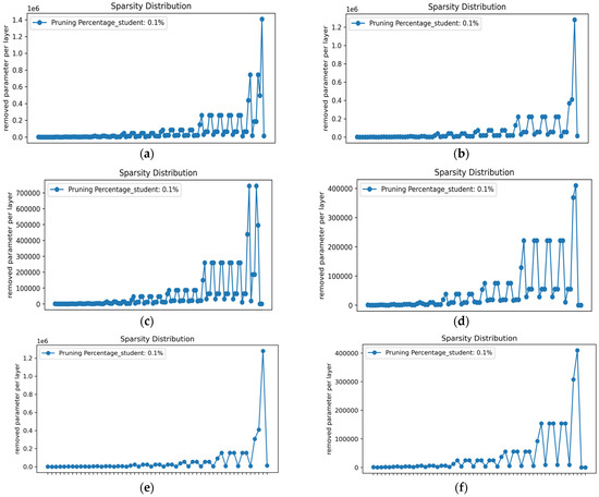 Sparsity distribution. Removed parameter in each layer: (a) Weight pruning on EfficientNet-b2; (b) Weight pruning on EfficientNet-b0; (c) Weight pruning on MobileNet; (d) Channel pruning on EfficientNet-b2; (e) Channel pruning on EfficientNet-b0; (f) Channel pruning on MobileNet.