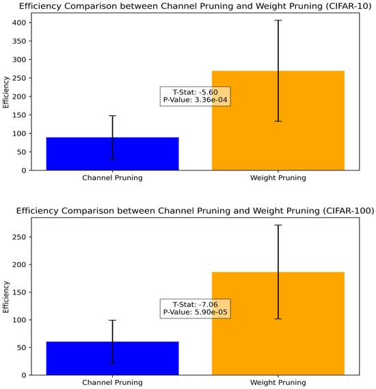 The t-test results reveal significant differences in efficiency between weight pruning and channel pruning for both the CIFAR-10 and CIFAR-100 datasets. For CIFAR-10, weight pruning outperforms channel pruning with a t-statistic of −5.60 and a p-value of 3.3 × 10−4, signifying high statistical significance. Similarly, for CIFAR-100, weight pruning demonstrates superior efficiency with a t-statistic of −7.06 and an even lower p-value of 5.90 × 10−5, indicating an extremely high level of statistical significance. These results consistently show that weight pruning is a more efficient choice, suggesting that when combined with knowledge distillation, it is likely to produce a model with a better balance between accuracy and reduced complexity. These findings provide valuable guidance for researchers seeking to optimize model performance and efficiency in different problem domains.